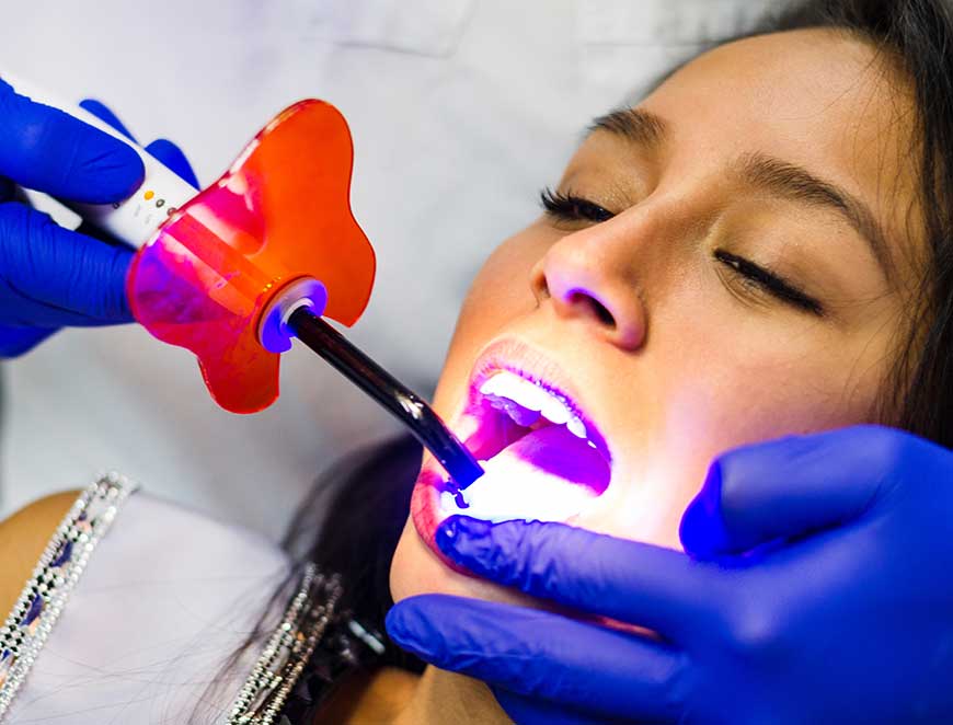 Let the whitening begin. An in-office treatment involves applying the whitening agent to each tooth and then using a UV light to activate it. At-home trays are ready to use as soon as you get home and come with complete instructions. The treatment may take more time than an in-office one.